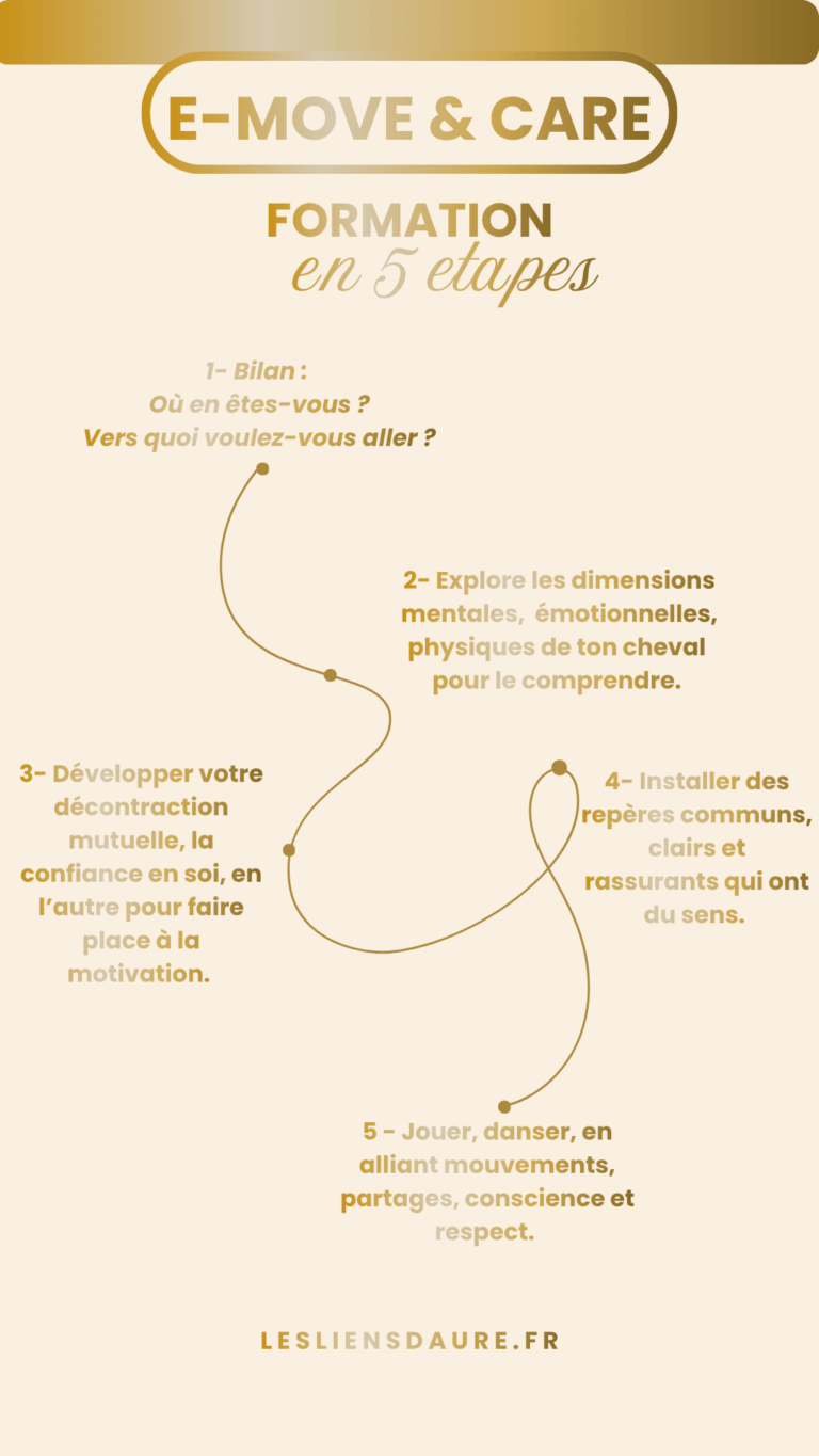 + de 40 chapitres théoriques et pratiques 5 étapes riches, cohérentes et puissantes sur la cognition de ton cheval mais aussi la tienne, sur la confiance en soi et en l’autre, sur la locomotion et le sens des mouvements que l’on demande au cheval. |
