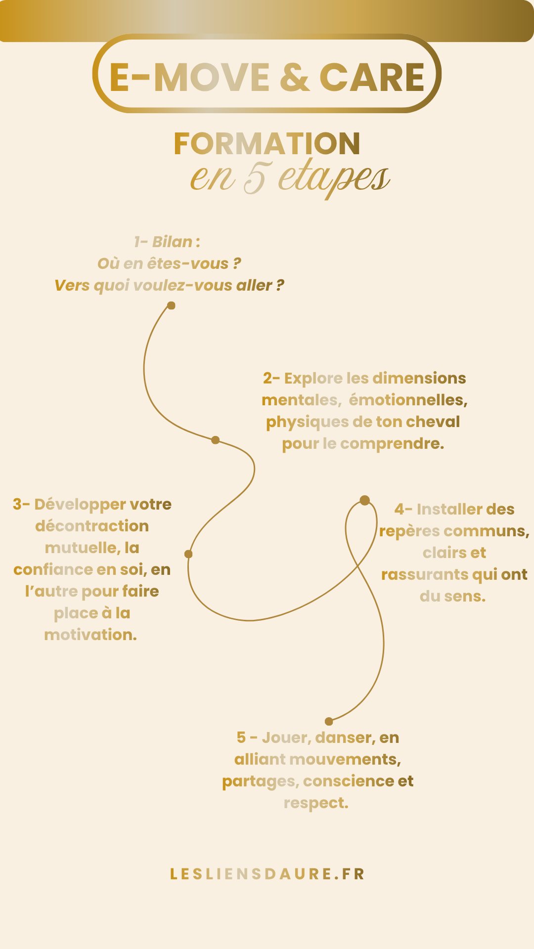 5 étapes riches, cohérentes et puissantes sur la cognition de ton cheval mais aussi la tienne, sur la confiance en soi, en l’autre, sur la locomotion et le sens des mouvements que l’on demande au cheval.